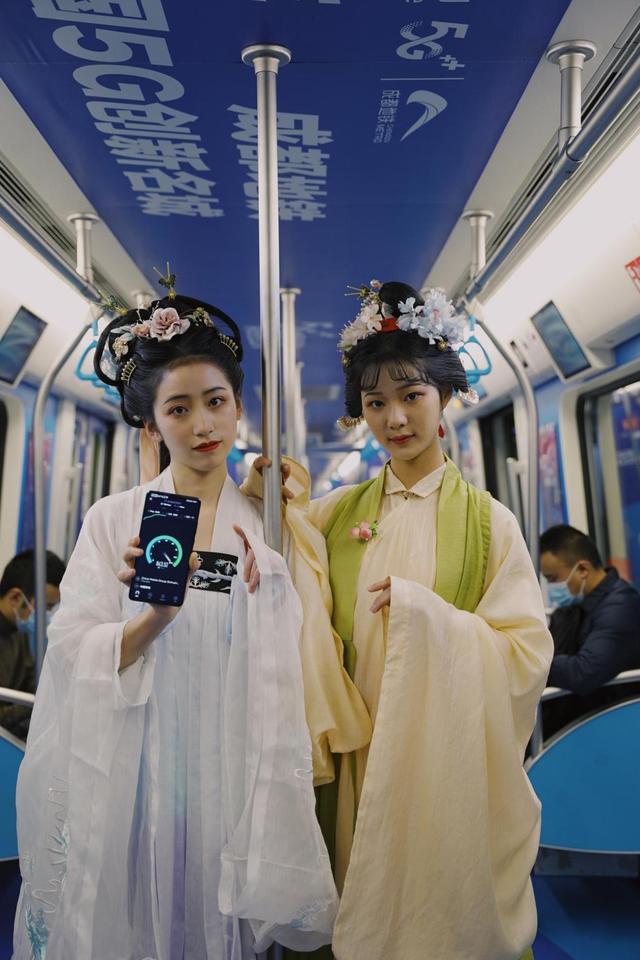 (汉服爱好者在成都地铁1号线5G打卡)