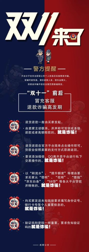 “双十一”前后,冒充客服诈骗高发。“不法分子在非法获取公民个人信息后实施精准诈骗,受骗可能性高,潜在被害人多,损失金额大。防骗的方法只有一个,不轻信、不转账、不透露,警惕陷阱! ”