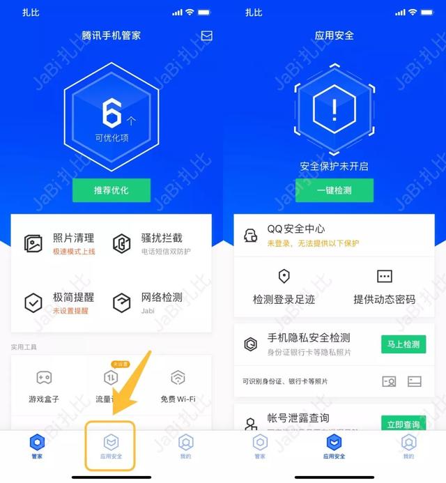 打开「腾讯手机管家」后,点击底部的「应用安全」。