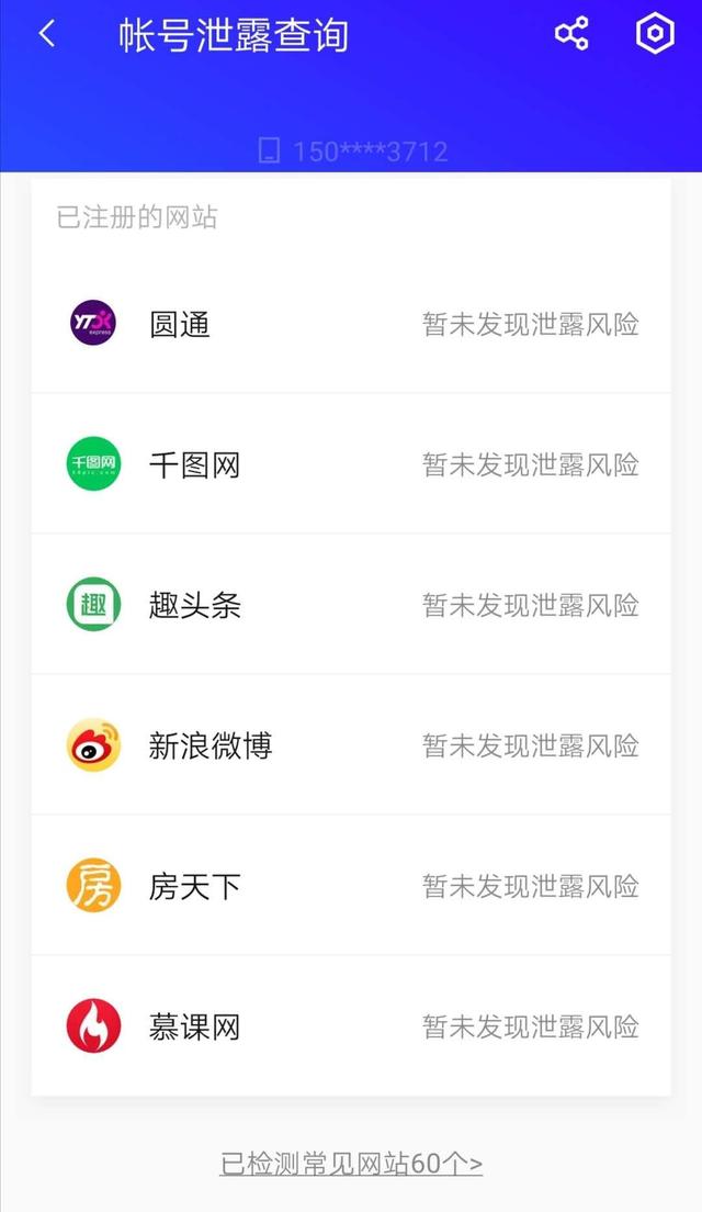 输入要查询的手机号,点击“同意”,需要手机验证码进行验证,填入后很快就能查询出结果了,下面是小编检测出来的结果,后面会显示个数,点击即可查看更多。